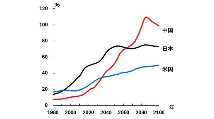 今後、中国の高齢化はさらに加速する。生産年齢人口に対する高齢人口(65歳以上)の比率は、現時点では日米より低いが、2036年頃に米国を超え、64年頃には日本をも上回ると見込まれている。