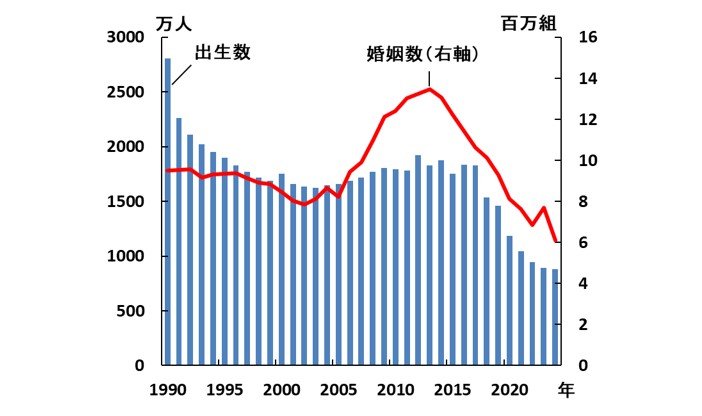 しかし、こうした諸施策の成果はいまだ現れていない。2024年までの約10年で出生数は半減し、建国以来の最低数を更新し続けている。婚姻数も同様に10年で大幅に減少している。