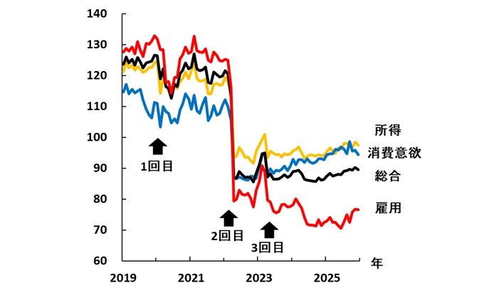 消費者心理は政府の新型コロナ対策と強く連動し、それが現状にも影響している。雇用・所得・消費意欲に関する家計の認識を指数化した消費者信頼感指数は、コロナ禍期に3回の顕著な下落を記録した。