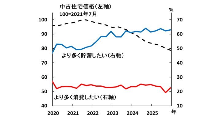 実際、住宅価格の下落と貯蓄志向の高まりは同時に進行している。70都市の中古住宅価格指数は2021年7月のピークから下落が続き、25年末までに累計で2割以上低下した。この間、中国人民銀行の都市預金者調査では、「より多く貯蓄したい」と回答する割合が年々上昇し、6割を超えている。その一方で、「より多く消費したい」とする割合は近年、減少傾向にある。